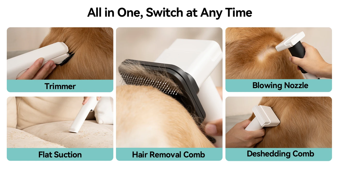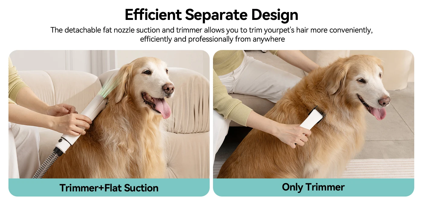 With the removable flat nozzle and trimmer, you can trim your pet's fur more comfortably, more efficiently and more professionally-no matter where you are.