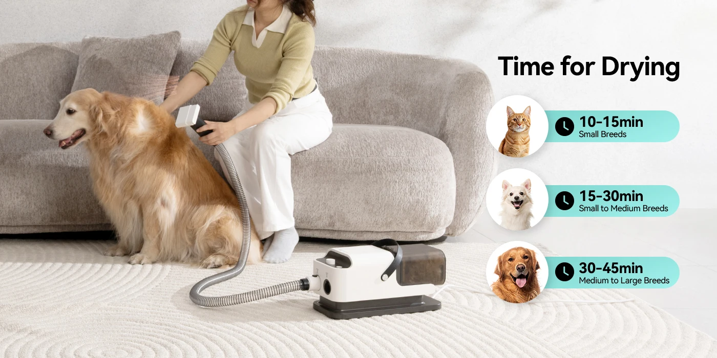 The adjustable super strong wind dries your pet quickly depending on the size and length of the coat.