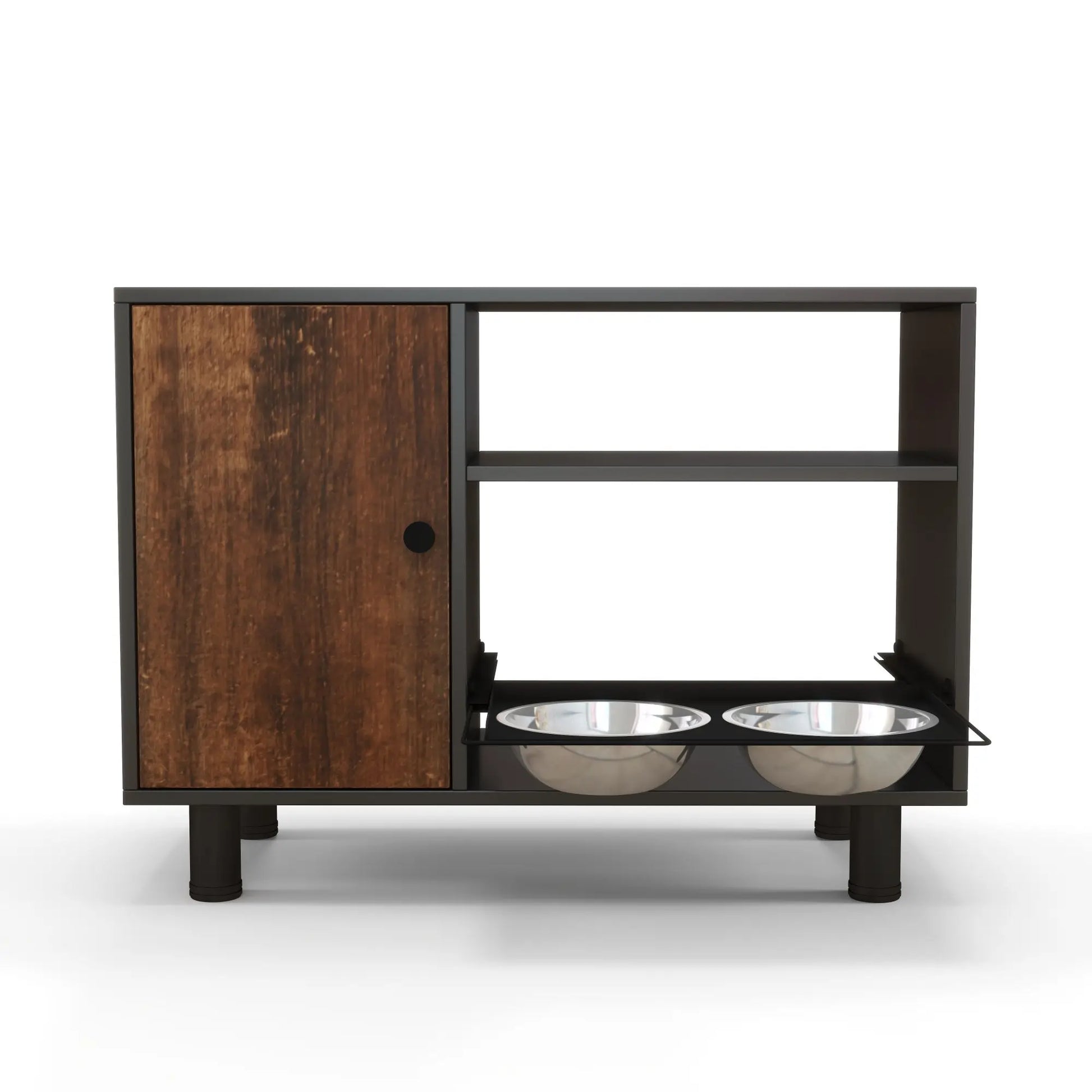 2. The large storage cabinet on the left side can store dog food, and the fixed rack on the right side can store dog snacks and toys.